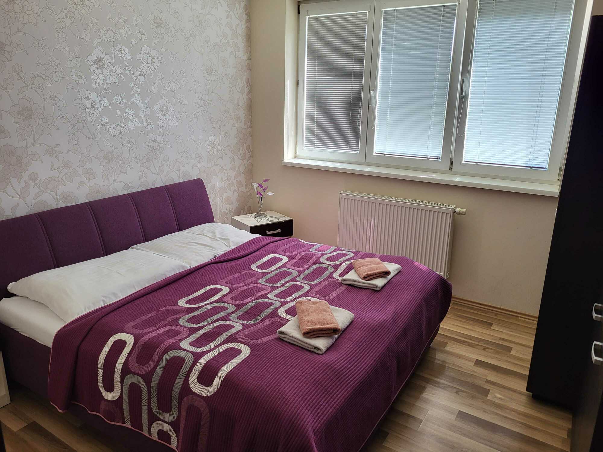 Po vstupe do apartmánu sa nachádzate v predsieni so vstavanou skriňou a skrinkou na topánky. Z predsiene sa vchádza buď do spálne s manželskou posteľou alebo obývacej časti apartmánu s rozťahovacou sedačkou a nábytkom. V obývacej časti sú balkónové dvere s východom na balkón. Apartmán je vybavený TV, chladničkou, rýchlovarnou kanvicou. Samozrejmosťou je samostatné WC s kúpeľňou.